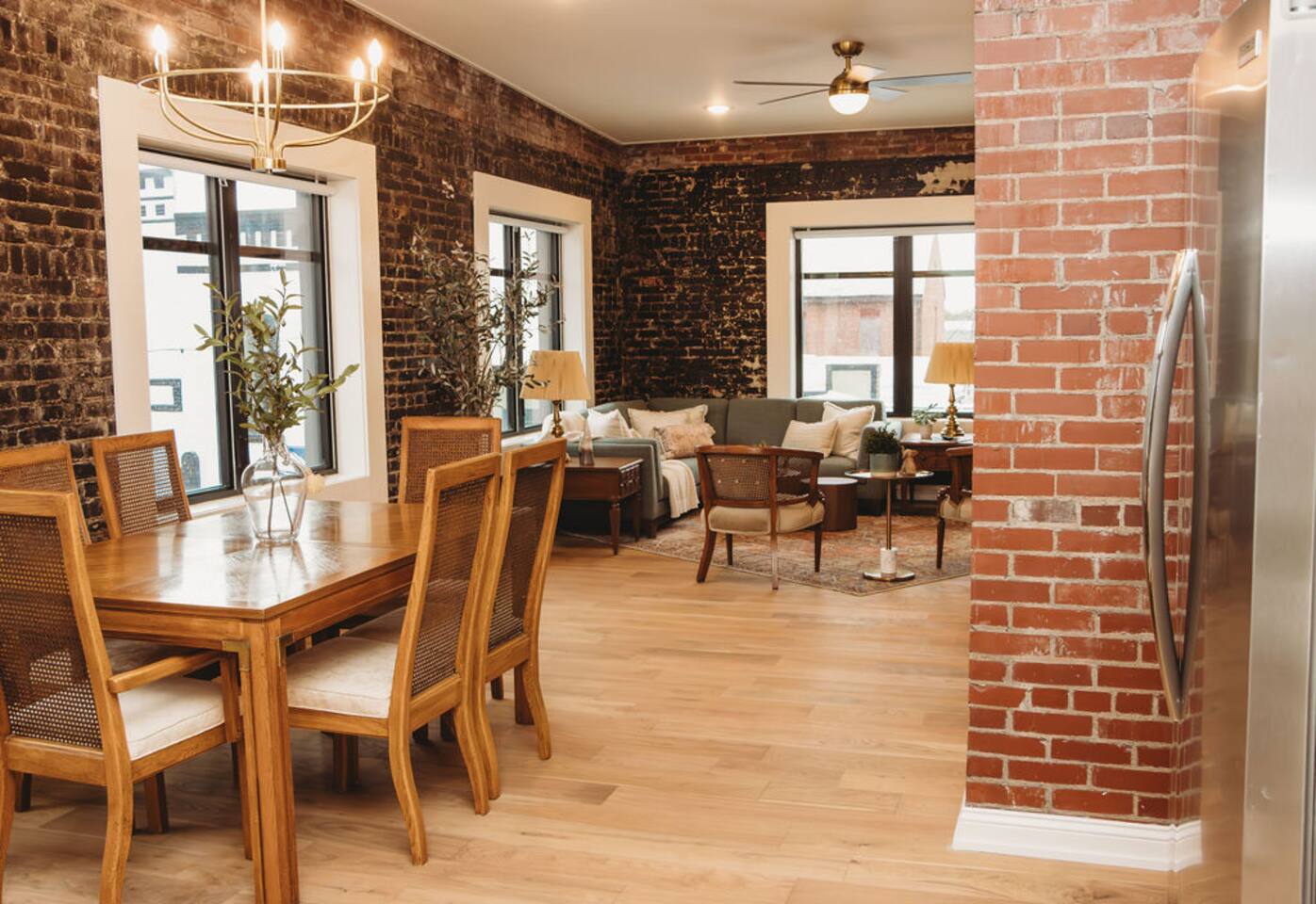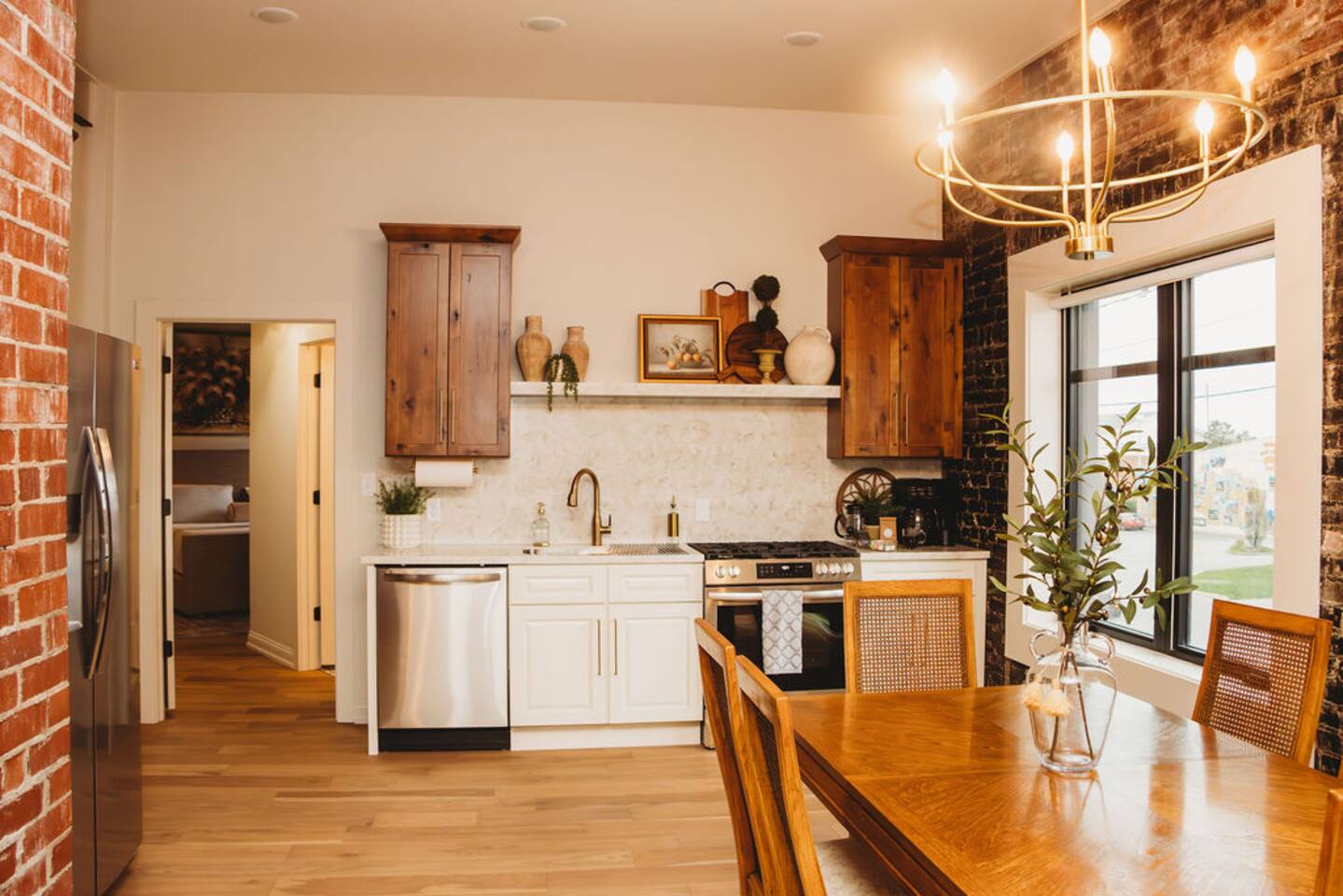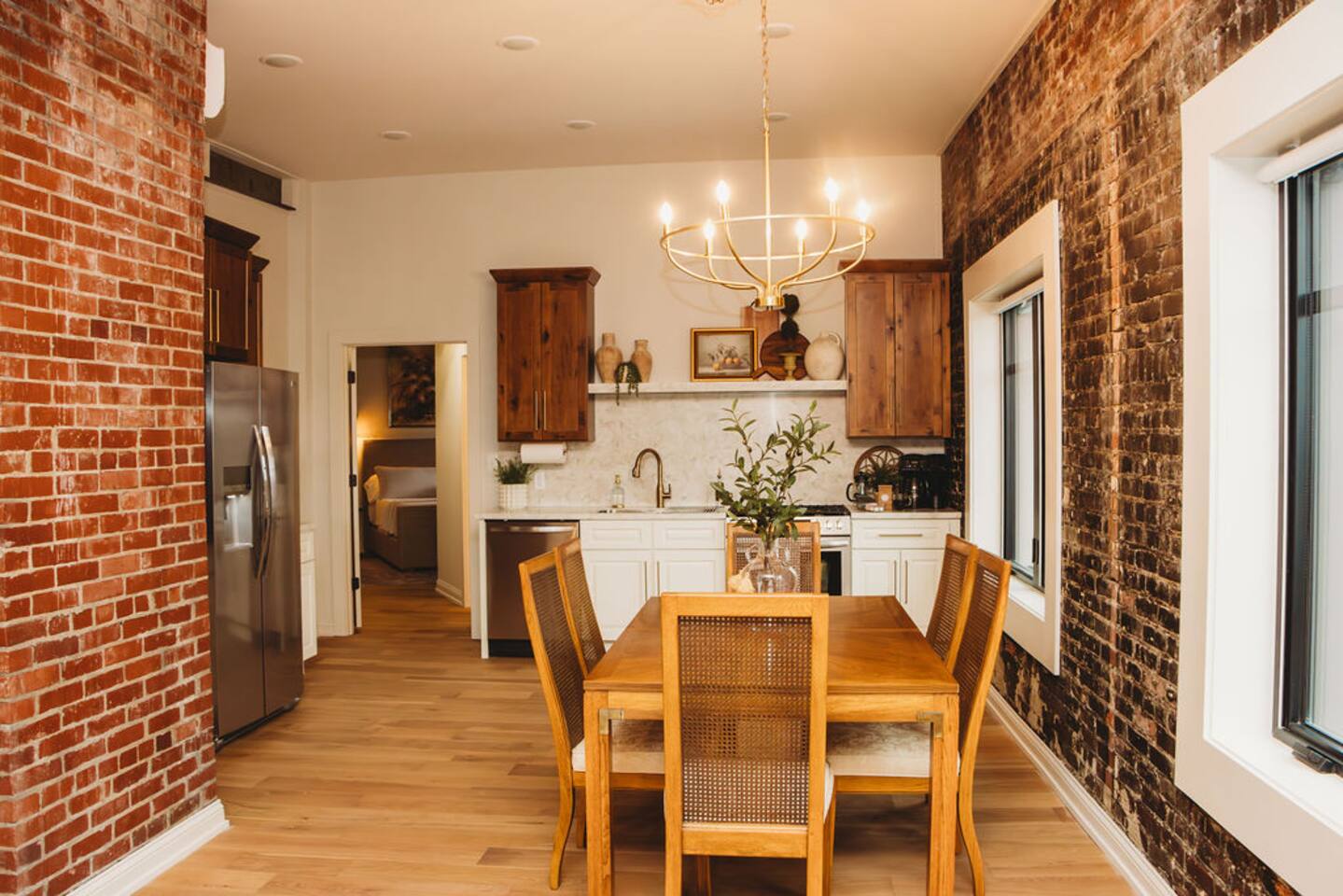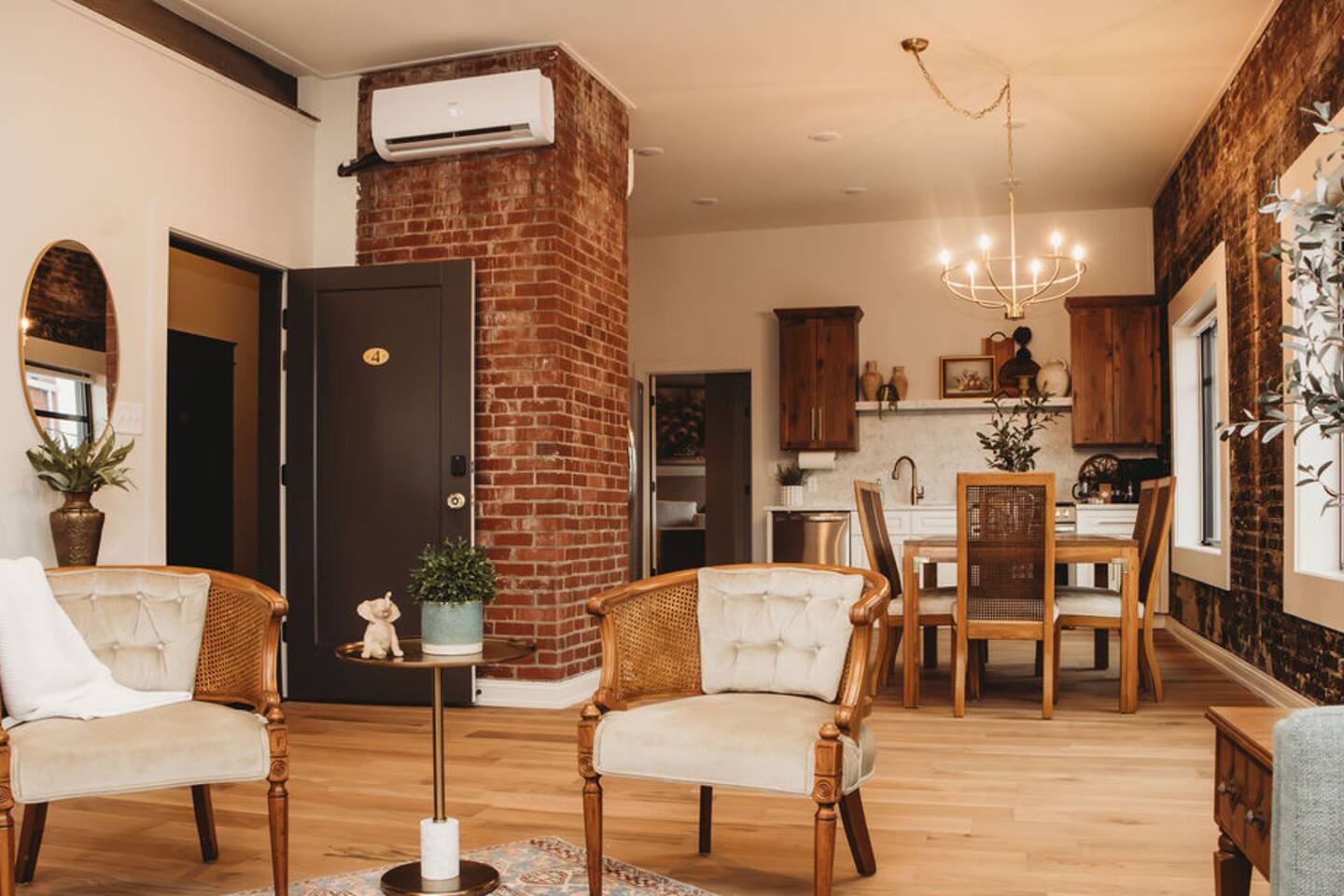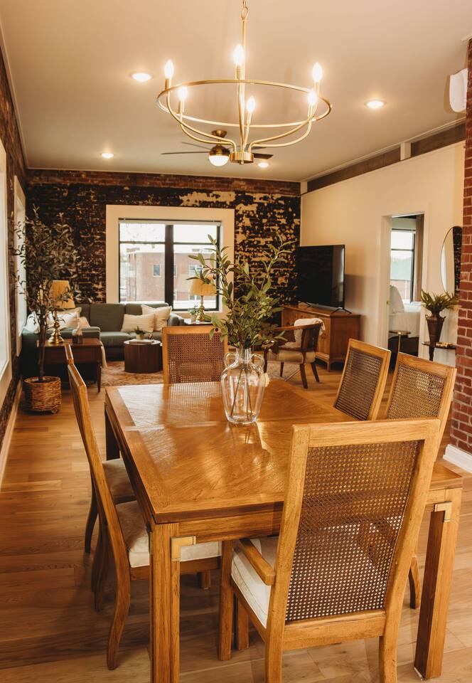 Welcome to The Eleanor! This newly renovated 2-bedroom (1 King & 1 Queen) / 2-bathroom historic suite gives elegant big city vibes. You will enjoy natural light in every room with a panoramic view of the downtown square. With a fully equipped kitchen, you can cook a 5-star meal or walk outside and enjoy the easy access to the city's shopping, dining, & entertainment venues. Your whole group will be comfortable in this elegant and unique stay inside the Historic 1935 Alexander Hotel.