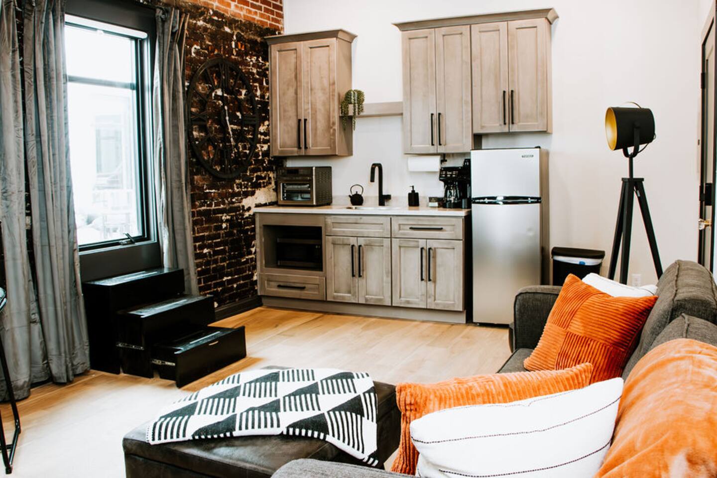 Completely remodeled from 2021 - 2024, this 22,000 square feet historical building is centered in the heart of downtown Leitchfield. Our location makes it walkable to boutiques, food, entertainment, the Storehouse Coffee, the Spa on Main & the Historic Jack Thomas House. In 1935, this building housed a restaurant, The Alice Theatre and a 23-room hotel called The Alexander Hotel. Today, this building is still home to The Alexander Hotel, which is now 7 short term rentals, The Alice Theatre which is now an event venue where you can enjoy live entertainment, old movies or rent the space for a special day or event of your own. The old restaurant has been revitalized and is now called Steak & Stone. (Both the Restaurant & Event Venue are set to be open Mid-May 2024). Each Airbnb has been meticulously curated and designed. Our space is unique in that you can rent a suite or two or our entire 2nd floor which contains 7 suites total: The Aaron (2 bed / 2 bath), The Ashton (1 bed / 1 bath), The Jackson (Studio / 1 bed / 1 bath / + Sofa Sleeper), The Haleigh (1 bed / 1 bath), The McKinzie (2 bed / 2 bath), The Chassedi (Studio / 1 bed / 1 bath), The Eleanor (2 bed / 2 bath). NOTE: Our suites are located on the 2nd floor with approximately 25 steps. Due to the historic nature and location of our building, elevators are not available. During your stay, you will have access to our local parks, lakes, kayaking, Leitchfield softball and baseball complex, pickleball courts, grocery stores & our revitalized town square. The Alexander Hotel is the prime location for East Main Market nights and the annual Twin Lakes Fiddling Festival. We are nestled between Rough River & Nolin Lake & only minutes from the Leitchfield Aquatic Center, Industrial Park & Owensboro Twin Lakes Regional Medical Center. We are 30 minutes from The Bluegrass Sportsplex, Sky's the Limit Trampoline Park, numerous golf courses including: Shady Hollow, Lafeyette, Vine Grove, Elizabethtown Country Club & Heartland Golf Course. We are also less than an hour from Mammoth Cave National Park, The Bowling Green Corvette Museum, Churchill Downs, and the Bourbon Capital of the World, Bardstown. We are 2 minutes away from the Western Ky Pkwy and 30 minutes away from I-65. If small town with big city vibes sounds like a good time, then we are the right place for you. The Jackson offers an open studio plan with a fully equipped kitchenette, 1 smart TV, 1 King plush and comfy beds, 1 full sofa sleeper, and 1 full bathroom with tub / shower combo.