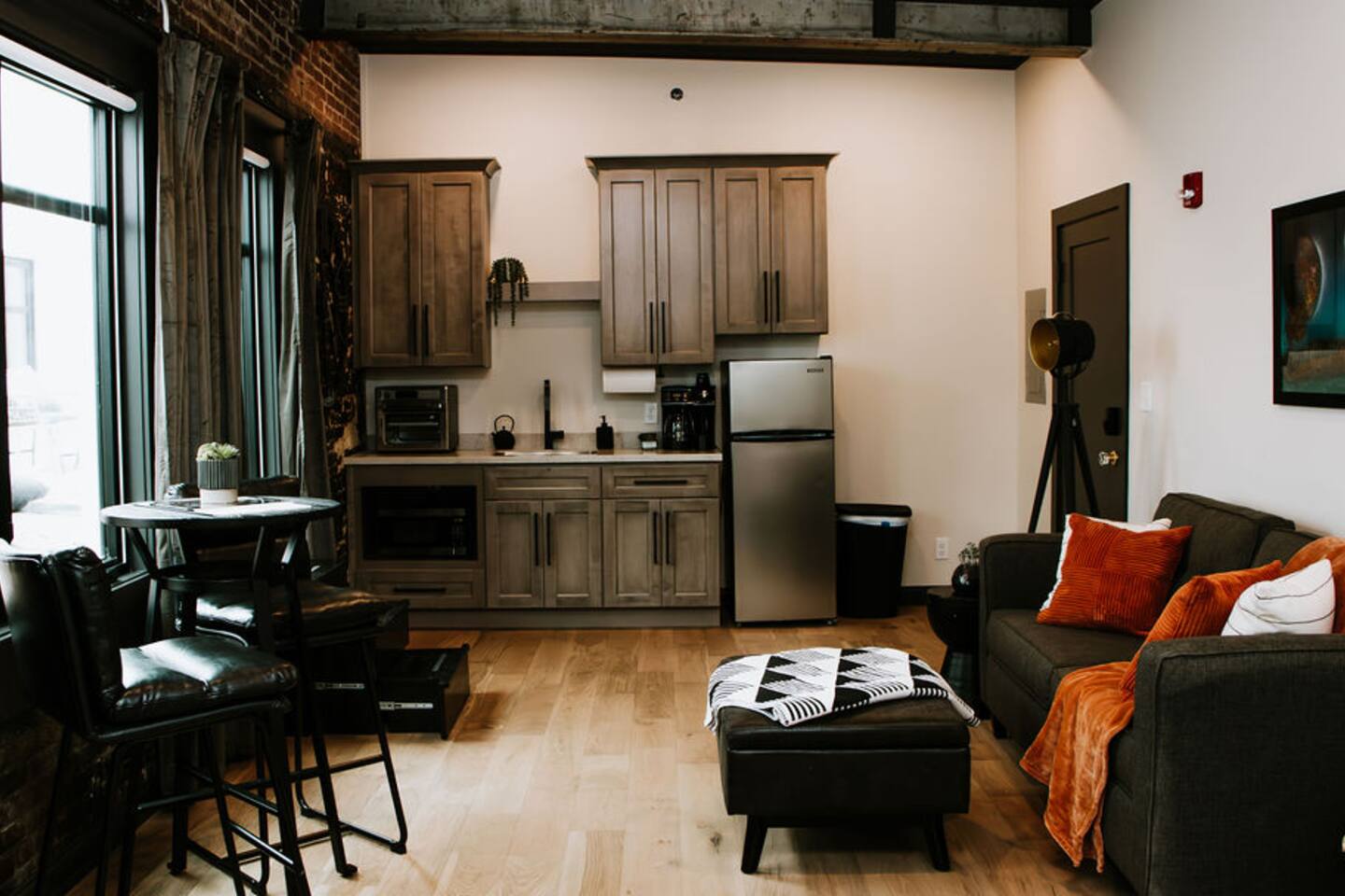 Welcome to The Jackson! This newly renovated spacious studio is one of our fan favorites. You will enjoy lots of natural light and room access to the outdoor courtyard. This open space has a living, kitchen, dining area, king bed, and sofa sleeper. With a fully equipped kitchenette, you can cook a quick meal or walk outside & enjoy the easy access to the city's shopping, dining, & entertainment venues. We think you will love the Jackson in the Historic Alexander Hotel. #leitchfield #kentucky